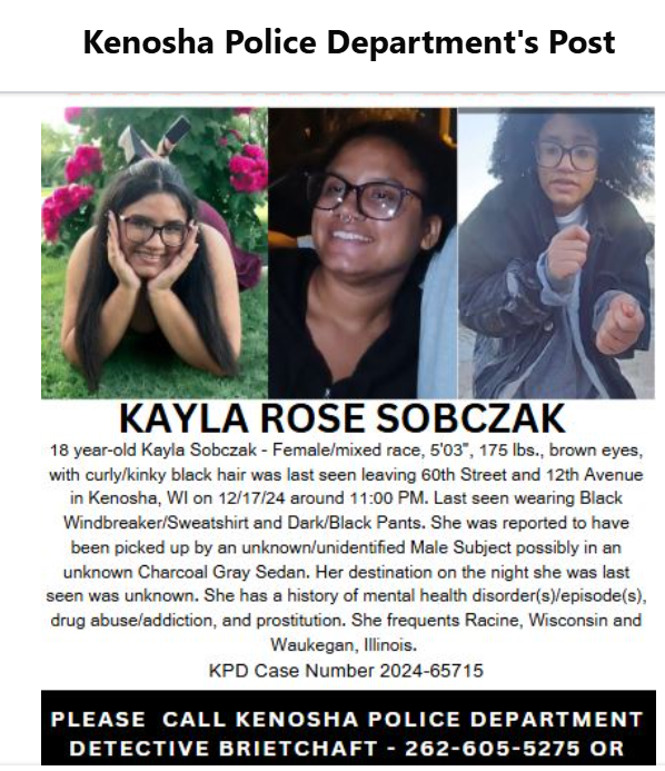 Details of Disappearance NCMEC gives very few details. On Tuesday, December 17th, 2024 (12/17/2024) at approximately 11:00pm (2300 hours),KAYLA ROSE SOBCZAK Mixed Race/Female18 Years-Old, was last seen leaving the 6000 block of 12th Avenue (located in the City of Kenosha, County of Kenosha, State of Wisconsin). SOBCZAK was reported to have been picked up by an unknown/unidentified Male Subject possibly in an unknown Charcoal Gray Sedan. SOBCZAK'S destination on the night she was last seen was unknown. Besides Kenosha, SOBCZAK was also known to frequent Racine, Wisconsin and Waukegan, Illinois. |